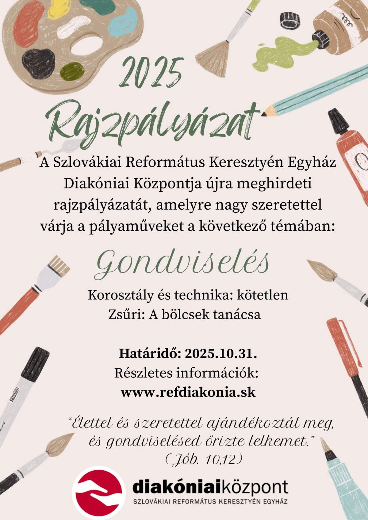 A Szlovákiai Református Keresztyén Egyház Diakóniai Központja újra meghirdeti rajzpályázatát, amelyre nagy szeretettel várja a pályaműveket a következő témában: Gondviselés. Amint az Úr gondoskodó szeretete betölti a mi életünket, úgy fürkészi be a mindennapjainkba az egymásra való odafigyelés fontosságát is. Hisszük, hogy miként saját terheinket az Úrra vethetjük, mert ő gondot visel rólunk, általa képessé válunk mi magunk is az embertársainkról való gondviselésre.